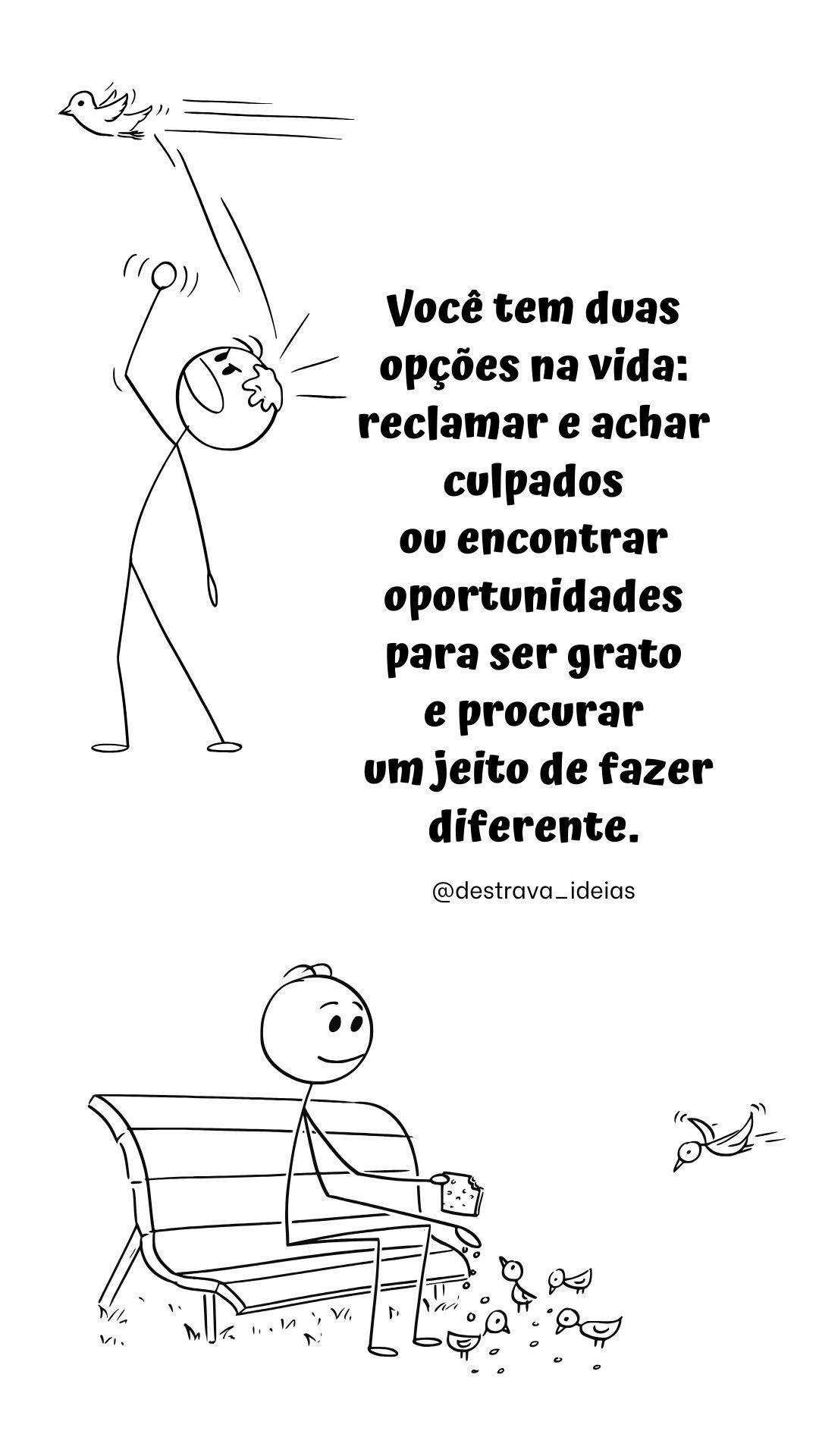 Você tem duas opções na vida: reclamar e achar culpados ou encontrar oportunidades para ser grato e procurar um jeito de fazer diferente. – @amufrases